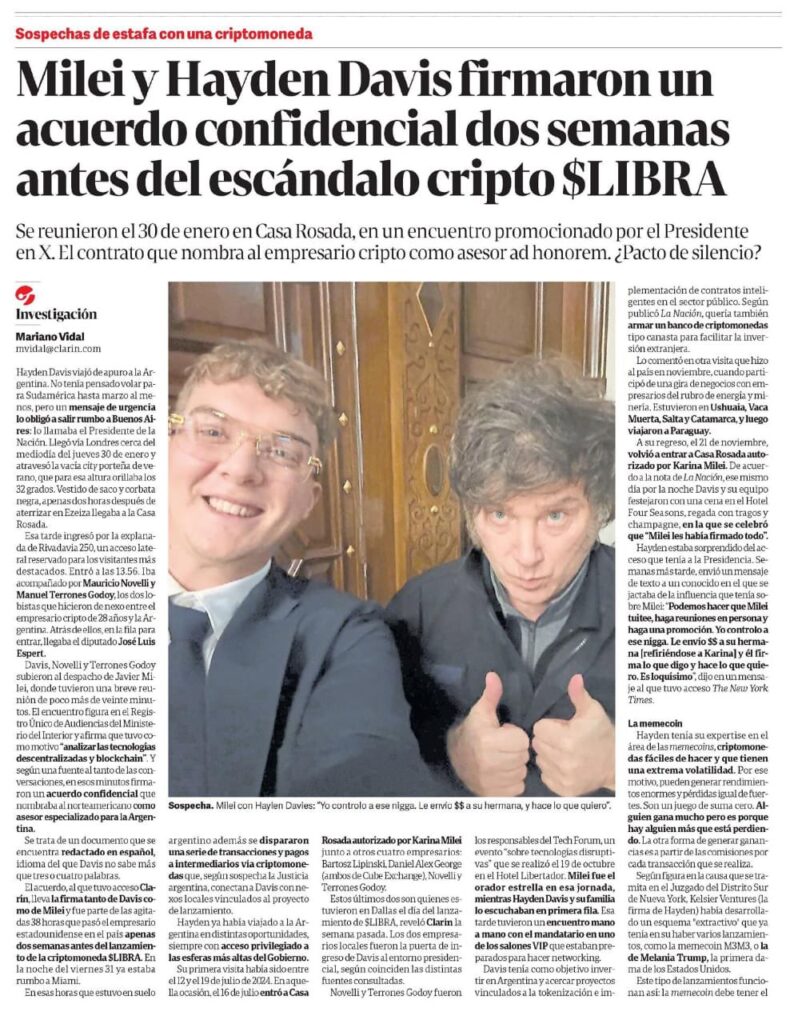 A fines de enero pasado, Davis visitó la Casa Rosada acompañado de Mauricio Novelli y Manuel Terrones Godoy, los dos lobistas que hicieron de nexo entre el empresario cripto de 28 años y la Argentina, detalla Vidal en su publicación y asegura que allí se firmó el acuerdo confidencial con el jefe de Estado.