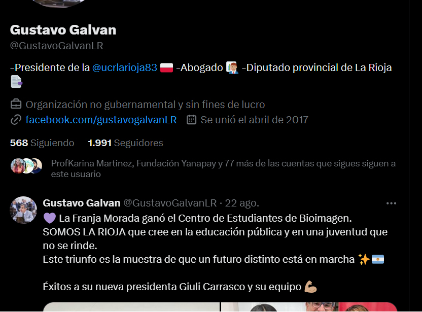 El último posteo de Galván hace referencia un truinfo de Franja Morada, y el anterior a la firma de su candidatura. No se encuentra nada sobre las coimas en ANDIS.