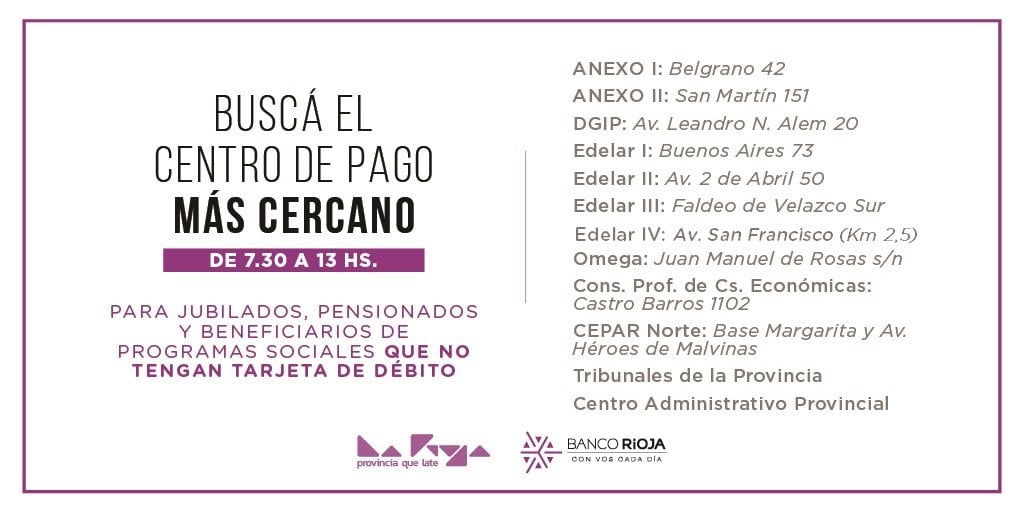 Desde la entidad bancaria anunciaron nuevas bocas de pago para descomprimir la atención y evitar la concentración de personas, en el marco de la pandemia por el Covid-19. Se trata de una nueva medida de Banco Rioja para colaborar con las medidas de prevención del COVID.
