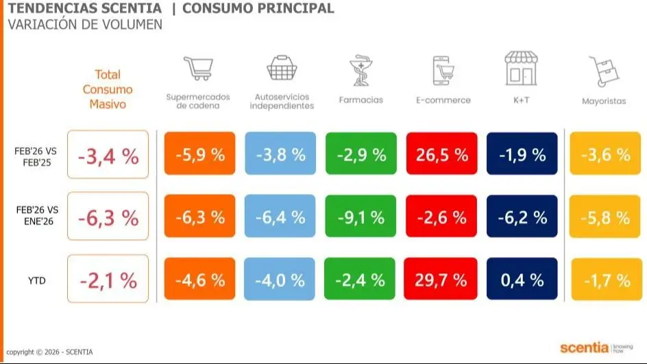 En medio de una crisis de los ingresos, el consumo tuvo un descenso parejo en todos los canales salvo el comercio electrónico, según advirtió el informe mensual de Scentia. El consumo masivo (alimentos, limpieza e higiene) volvió a caer en febrero por segundo mes consecutivo, esta vez por más de 3 puntos, en la que es la mayor caída en un año. Se trató de una baja pareja en todos los canales, excepto por por el comercio electrónico.