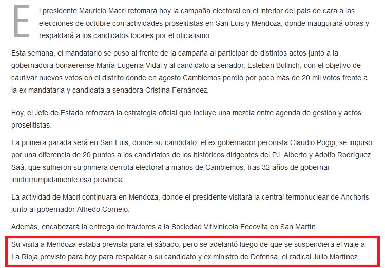 Finalmente, el presidente Mauricio Macri postergó su visita a La Rioja, y llega mañana sábado a la Provincia. En primera instancia sería recibido por el gobernador Sergio Casas y posteriormente desarrollaría diversas actividades relacionadas con la campaña para las elecciones legislativas de octubre.