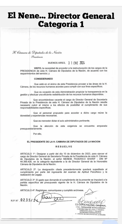 En enero de 2024 Federico Sharif Menem fue nombrado como personal del Congreso de la Nación con la categoría 1, la más alta de los empleados de las Cámaras, y un sueldo que supera el millón y medio de pesos.