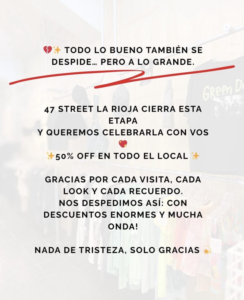 Mientras tanto, en La Rioja en menos de un mes se anunció el cierre de dos locales muy importantes para la Ciudad: Cuatro Vientos, que debe cerrar sus puertas después de más de 30 años de vida, y ahora 47 Street.