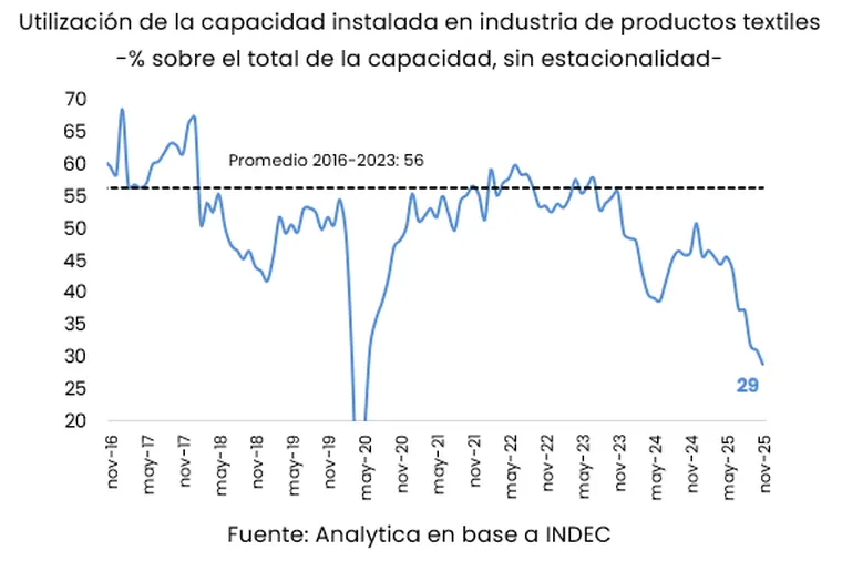 El impacto de la crisis se refleja con crudeza en los datos. Según un informe de la consultora Analytica, la industria textil acumuló caídas en 10 de los 11 meses de 2025, consolidándose como la actividad más golpeada del Índice de Producción Industrial (IPI). En noviembre, la producción textil se ubicó 31,2% por debajo de diciembre de 2024 y 47,6% menos que en noviembre de 2023.