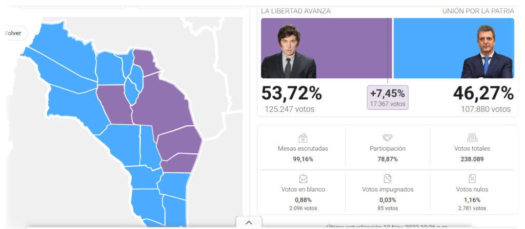 El peronismo volvió a pintar de celeste a La Rioja en el mapa nacional, donde predomina el color violeta, y logró revertir el resultado en tres Departamentos: Chilecito, Arauco y Chamical.