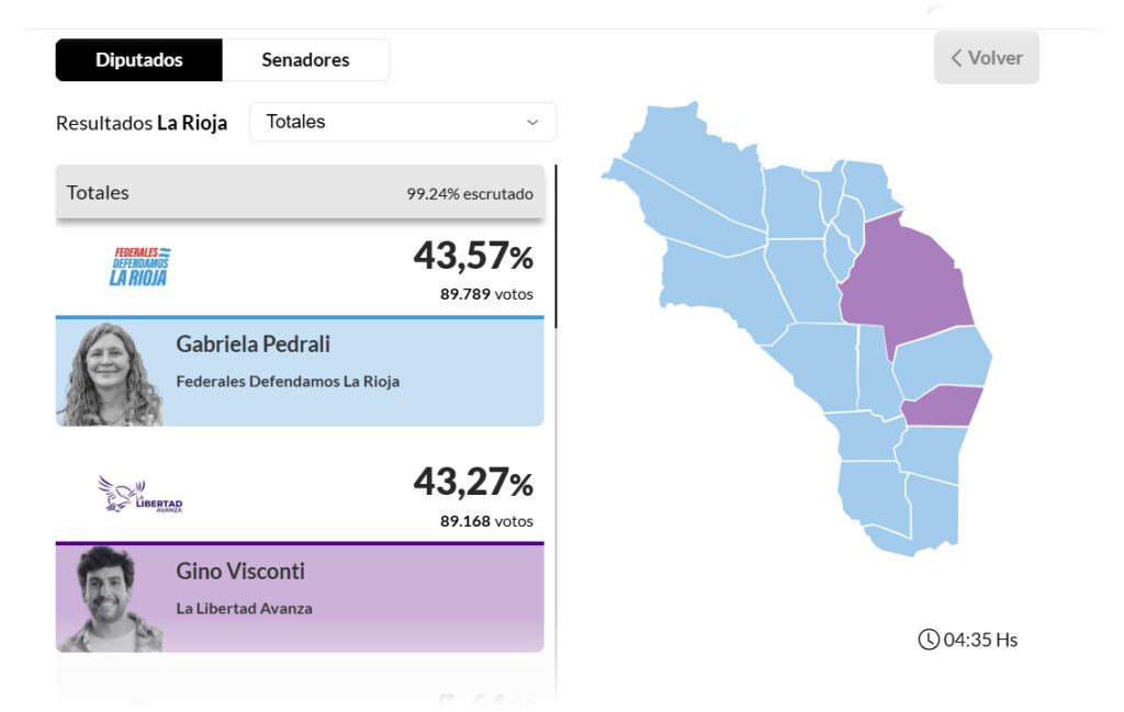 LLA ganó en toda la Provincia con una diferencia de casi 20.000 votos, venciendo en cinco Departamentos, cuatro de ello denominado ‘grandes’: Capital, Chilecito, Arauco, Chamical y General Belgrano. Por dos años, hasta el Domingo, LLA se jactaba de haber pintado de violeta una provincia que históricamente es peronista. Pero el Domingo, Gabriela Pedrali volvió a pintar de Celeste La Rioja: