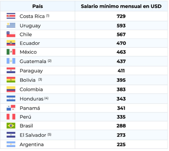 Así, actualizado a noviembre de 2025, el salario mínimo argentino es el más bajo de toda la región con 225 dólares, muy lejos de Costa Rica, que lidera con 729 dólares, y los países que le siguen: Uruguay (593 dólares), Chile (567), Ecuador (470) y México (463).