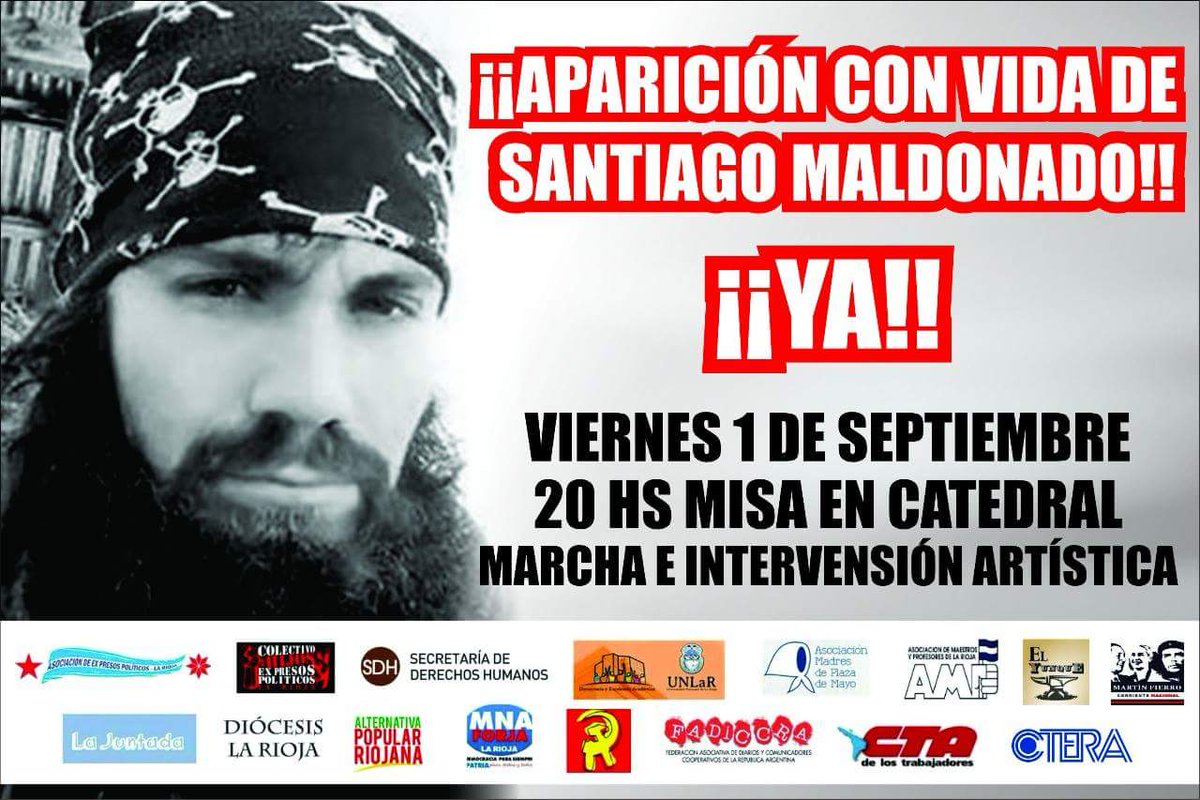 Organizaciones sociales y de derechos humanos convocan nuevamente a marchar en la Plaza 25 de Mayo para exigir la aparición con vida de Santiago Maldonado a casi un mes de su desaparición. El secretario de Derechos Humanos de la Provincia, Delfor Brizuela informó sobre la convocatoria de una nueva marcha en la Capital riojana, este viernes a las 20 hs en Plaza 25 de Mayo, para exigir la aparición de Santiago Maldonado.
