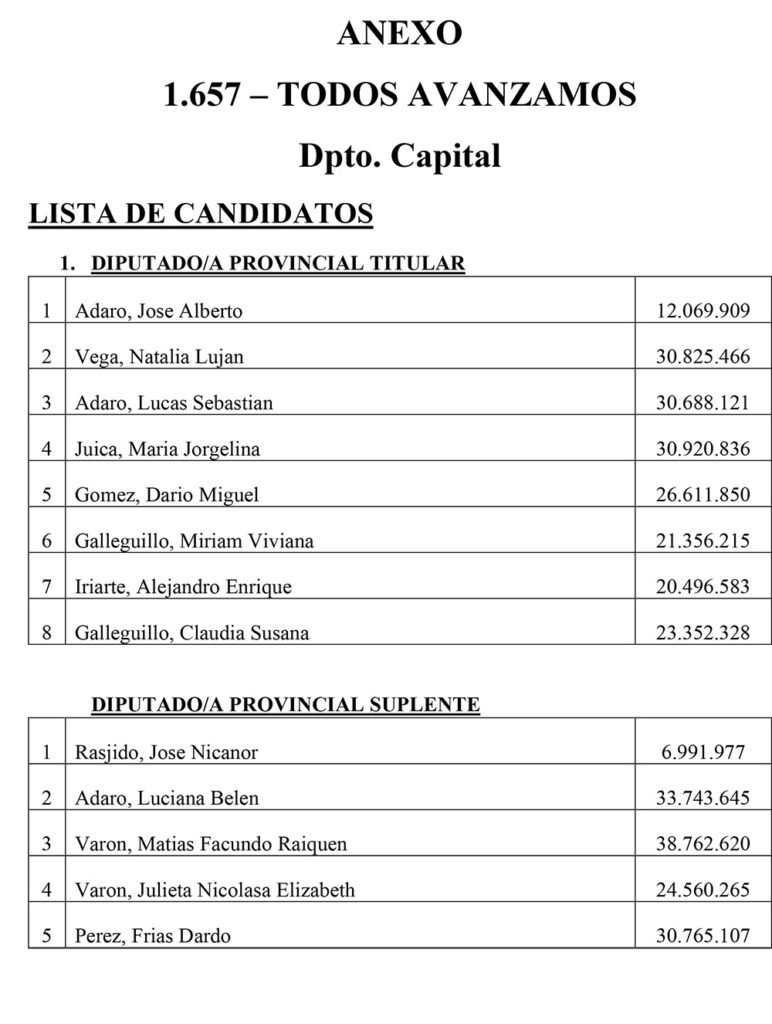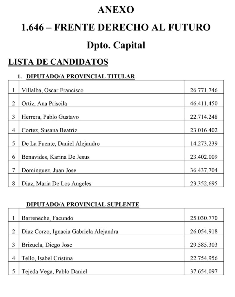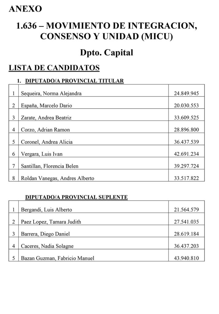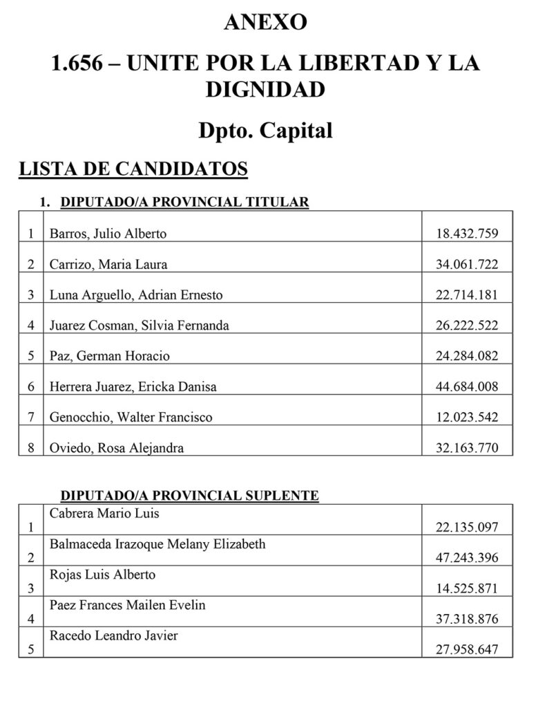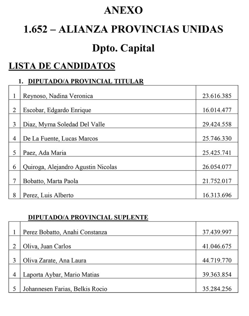 El Sábado se presentaron 25 listas para Diputados Provinciales en el Departamento Capital. Las listas más importantes, con posibilidades de disputar las bancas, son encabezadas por Juanqui Santander, Claudia López, Nazareno Rippa, Ismael Bordagaray, Paredes Urquiza y Nadina Reynoso. En esta nota te mostramos los 325 candidatos a diputados provinciales que estarán en las 25 listas el próximo 26 de Octubre en el cuarto oscuro en Capital.