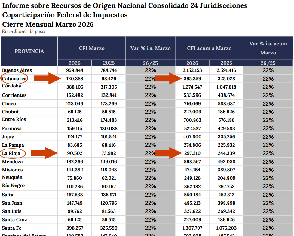 Como se ve en el cuadro, hay una evidente ventaja de Catamarca con respecto a La Rioja. Dos provincias muy similares en sus condiciones políticas, sociales y económicas; pero una recibe 30 mil millones de pesos más por mes. ¿Por qué? Por el punto de coparticipación perdido por La Rioja en 1989.