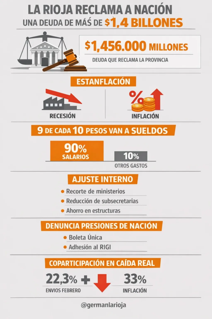 Es allí donde se explica la severa crisis económica que atraviesa La Rioja: en el cese de transferencias nacionales, reclamando a Nación una deuda que supera los $1,4 billones (o más de 1.200 millones de dólares) por fondos extracoparticipables retenidos desde fines de 2023.
