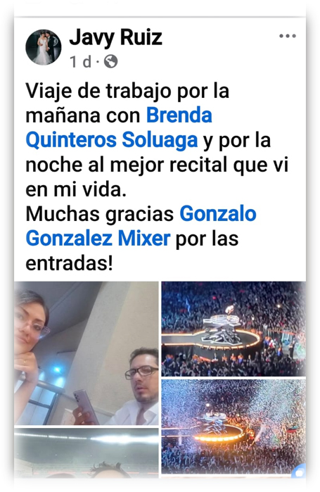 Con un posteo en sus redes sociales, el dirigente libertario Javier Ruiz mostró uno de sus tantos viajes a Buenos Aires, en este caso acompañado por su mujer y con presencia en el recital de ACDC. Sumando el costo de las entradas (iban desde 200 a 450 mil pesos), más los dos pasajes aéreos, más el hospedaje, se estima un gasto no menor a dos millones y medio de pesos.