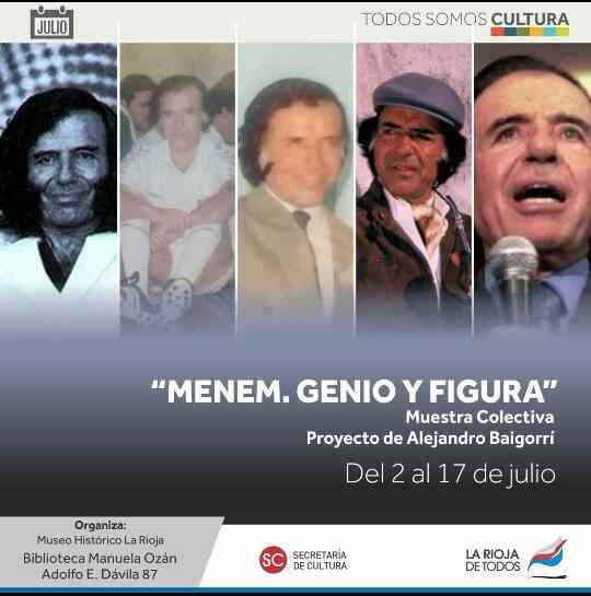 En el día del cumpleaños número 88 del ex presidente Carlos Saúl Menem, será inaugurada hoy la muestra colectiva «Menem, Genio y Figura». Se trata de un proyecto de Alejandro Baigorrí que podrá visitarse hasta el 17 de julio en el Museo Histórico (Adolfo Dávila 87). Es considerada la primera muestra del país de estas características y dedicada al riojano, se invita además a sumarse con sus propias imágenes.