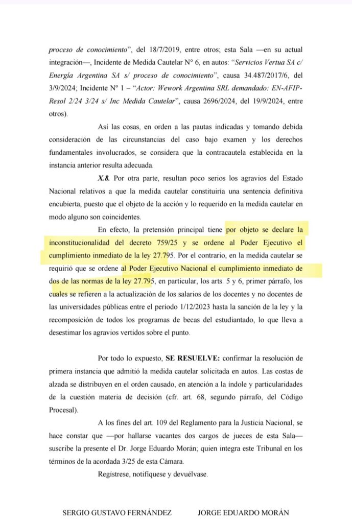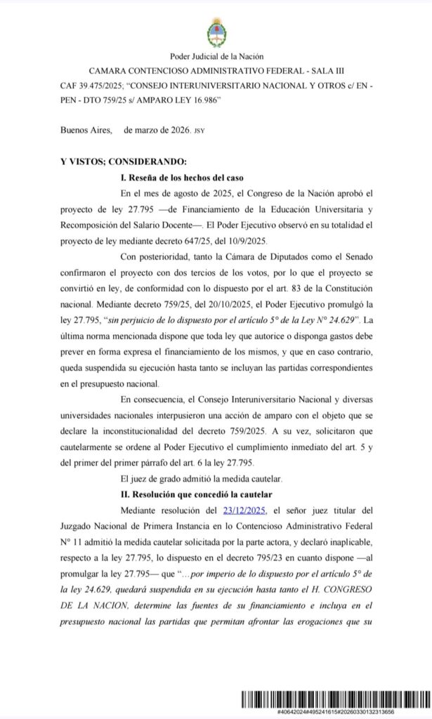 «La Ley de Financiamiento Universitario -recalcó- debe cumplirse ya. Deben actualizarse hoy los salarios docentes, los presupuestos universitarios, las becas y los montos asignados a investigación e innovación. Milei debe acatar lo que determinó la Justicia. De no hacerlo, estará incumpliendo sus deberes como funcionario público».