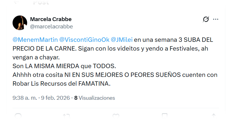 Si hay algo que no se le puede decir o chicanear a Marcela Crabbe es ‘Kuka’; por el contrario, desde su aparición y durante toda su carrera se caracterizó por criticar con dureza y denunciar sin tapujos a la ex Presidenta Cristina Fernandez de Kirchner y varios de sus funcionarios por Corrupción. También hizo lo propio con cuanto dirigente peronista riojano que se le cruzaba en el camino. Por eso es noticia la fuerte crtítica que lanzó en sus redes sociales contra el Gobierno Nacional y sus representantes en La Rioja.