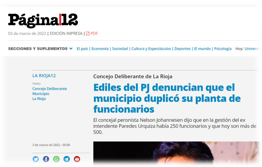 Lo dijo el concejal Nelson Johannesen quien sostuvo que durante la gestión del ex intendente Alberto Paredes Urquiza la comuna tenía 250 funcionarios mientras que con la llegada de Inés Brizuela y Doria al Ejecutivo Municipal esa cifra supera hoy las 500 personas. «Había 250 funcionarios en el municipio cuando empezó esta gestión y hoy son más de 500», le dijo el concejal peronista a La Rioja/12.