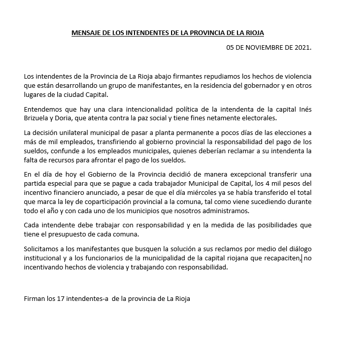 Los intendentes de la Provincia de La Rioja abajo firmantes repudiamos los hechos de violencia que están desarrollando un grupo de manifestantes, en la residencia del gobernador y en otros lugares de la ciudad Capital.
