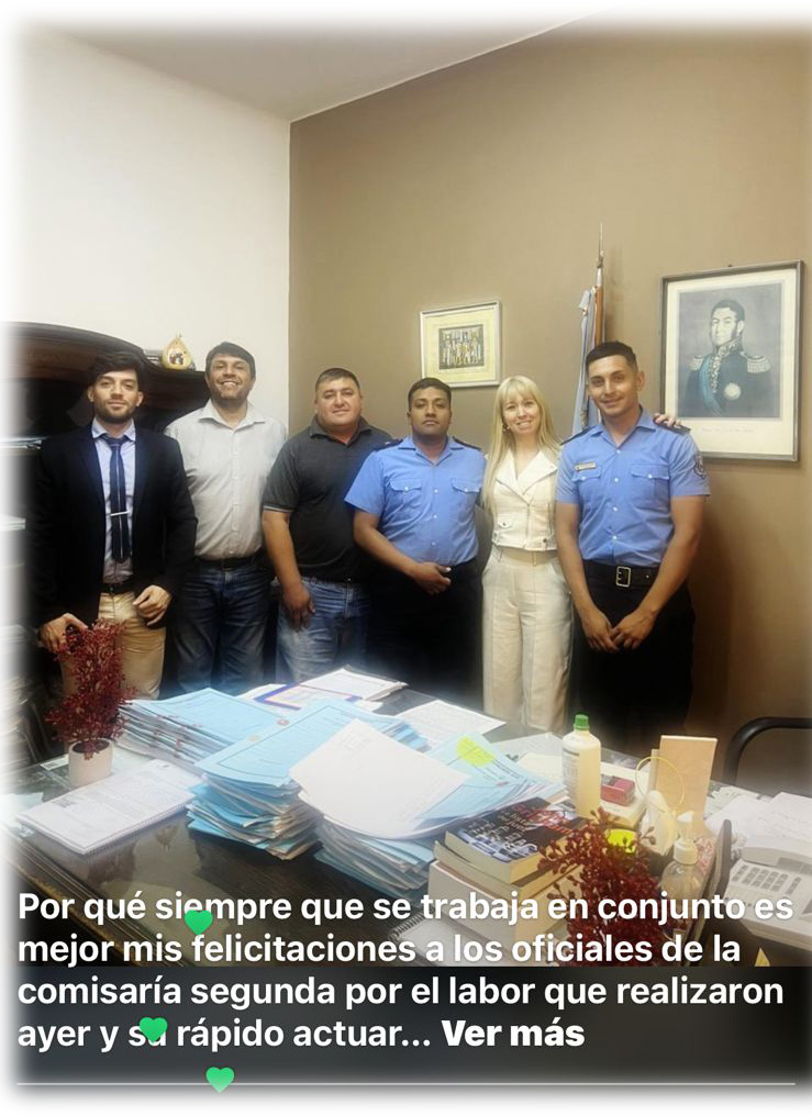 La Jueza Cecilia Córdoba convocó esta mañana a oficiales de la Comisaría Segunda a su oficina para felicitarlos personalmente por el trabajo en conjunto que se lleva a cabo en feria judicial. En caso en particular que motivó este encuentro y felicitaciones de la magistrada fue lo ocurrido ayer en el Barrio Infantería.