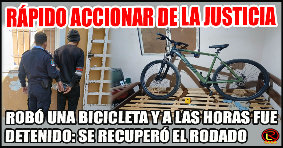 BREVE RESEÑA: Al efectuar dicho diligenciamiento procesal, arroja resultado POSITIVO, efectuando la DETENCIÓN del autor en su habitación como así también el SECUESTRO de la bicicleta. Coopera personal de Criminalística a cargo del Of Ayte RENTERA Joaquin.