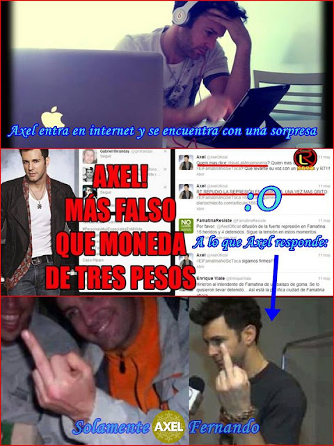 Y por ahi no lo digo yo, lo dicen millones, como esta publicacion lo hice llegar a la fan page Solamente Axel Fernando, los seguidores de repente dieron sus opiniones y todos fueron en contra de la publicacion de la foto. Y todos estuvieron enojados por la forma DIRECTA en la que como le dicen FALSO a Axel.