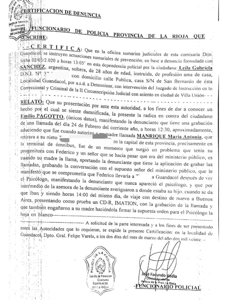 El documento, fechado en marzo de 2020 y certificado por la Comisaría de Guandacol, detalla cómo el abogado habría engañado a la familia del niño, asegurando que lo trasladarían para una evaluación psicológica, cuando en realidad fue llevado a Buenos Aires sin autorización.