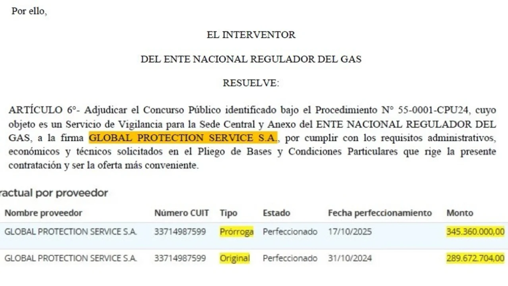 Casualmente o no tanto, esas dos licitaciones en las que habría reemplazado a Tech Security fueron, en ambos casos, prorrogadas. Una de ellas, impulsada por el Teatro Nacional Cervantes, acumula $600 millones y vence pronto, en diciembre de este año. La otra, ordenada por el Enargas, fue prorrogada hace menos de un mes: el 17 de octubre, Día de la Lealtad Peronista. Se trata de un “servicio de vigilancia” para la sede y el edificio anexo de la entidad y, hasta ahora, suma unos nada desdeñables $635 millones para los Hazaff.