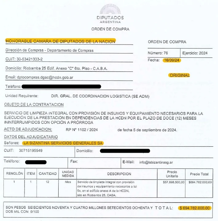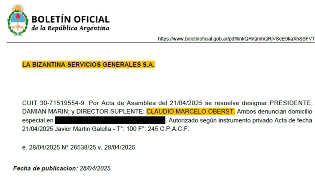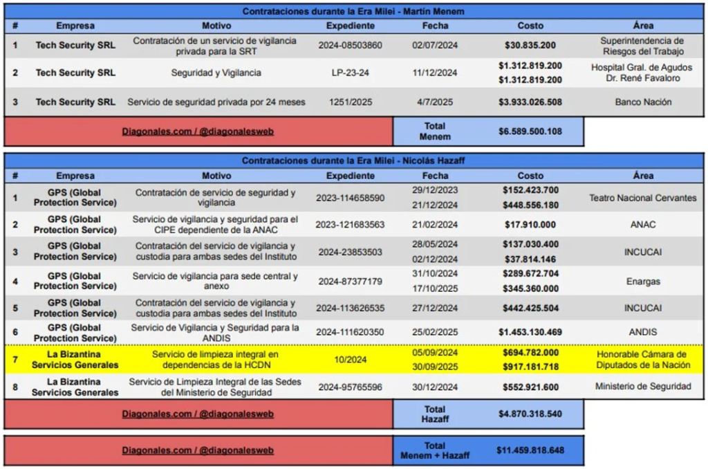 La Bizantina Servicios Generales es una compañía de limpieza creada en 2015 bajo el nombre de Pulizia e Purezza SA. La firma fue cofundada por Claudio Marcelo Oberst, cuñado de Nicolás Hazaff y director suplente de la empresa. Su gestión logró acceder a numerosos contratos en el Estado Nacional, entre ellos dos generosas licitaciones en la Era Milei: una encargada por el Ministerio de Seguridad, por la que facturó más de medio millón de pesos, y otra tres veces más abultada auspiciada por la Cámara de Diputados de Martín Menem.