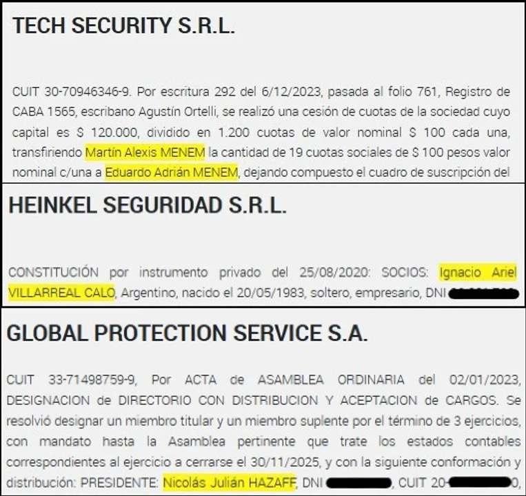 La pista del empleado es la menos directa. Gira en torno a Ignacio Ariel Villarreal Calo, un individuo que fue contratado por dos firmas de la familia Menem: Tech Security SRL y Purgato. En 2020, el hombre fundó Heinkel Seguridad SRL, luego reabutizada como Hub Security SRL. Y un año después de su creación, la sociedad fue adquirida por Leonardo Martino y Matías Gigena, dos empleados de Hazaff en Global Protection Service (GPS), compañía que heredó varias licitaciones públicas dejadas atrás por los riojanos. En síntesis, el nexo es el siguiente: