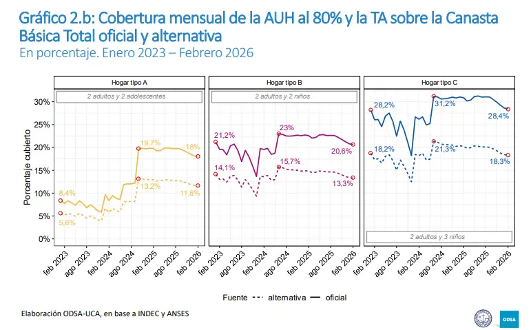 ¿Cuánto cubren realmente estos ingresos en la actualidad? Para dimensionar el impacto económico real hay que contrastarlos con el valor de la Canasta Básica Alimentaria (CBA) y la Canasta Básica Total (CBT). “En 2024, los aumentos extraordinarios en los montos otorgados por la AUH y la TA, junto con la nueva fórmula de actualización de la primera aplicada a partir de abril y la extensión de la cobertura de la segunda a partir de octubre, permitieron que los porcentajes bajo análisis se estabilizaran hacia el tercer y cuarto trimestre en valores históricamente altos” señaló un documento realizaron por el Observatorio de la Deuda Social Argentina (OSA) de la UCA. Sin embargo, el derrotero fue a la baja en 2025 y en el comienzo de este año “tanto la AUH y como la Tarjeta Alimentar pierden cobertura contra el costo de vida”, precisaron.