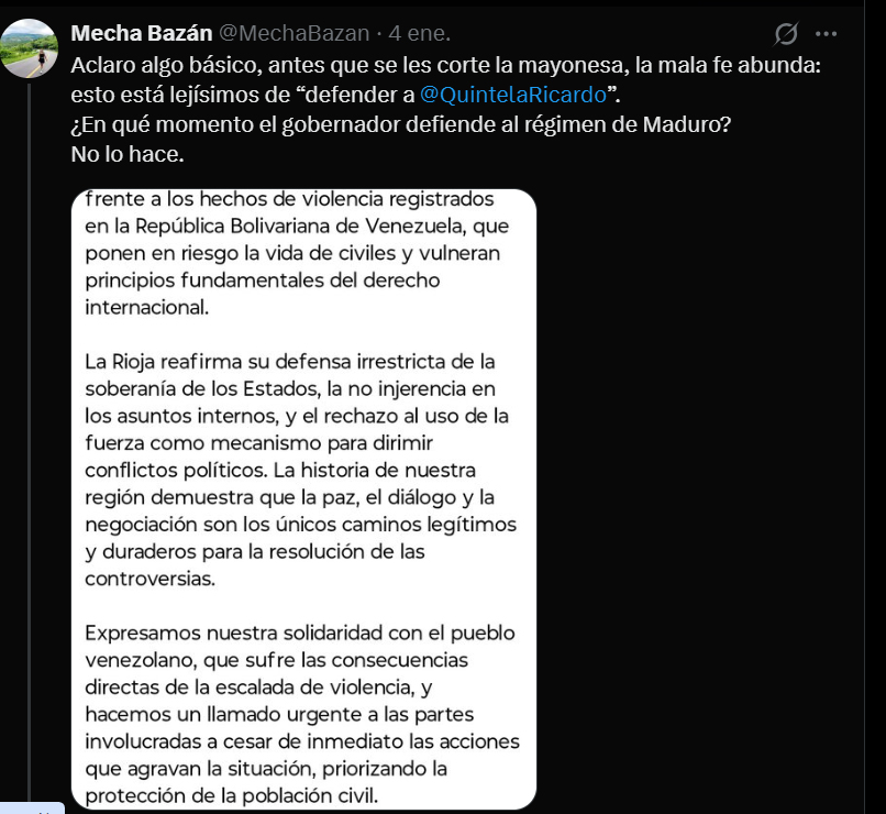 «Ya casi escriben igual, y no es casualidad; un partido centenario, vaciado de ideas pero todavía con algunos cuadros formados, termina llegando a las mismas conclusiones que un paracaidista político, peligroso, triste», disparó la dirigente radical Mecha Bazán, comparando el posteo del Diputado Libertario Gino Visconti con el Comunicado de la UCR La Rioja sobre el ataque de EEUU a Venezuela. «Dan pena, y duele ver en qué han convertido al partido. Reducir el radicalismo a un refugio básico, bajo y resentido de antiperonistas está MUY lejos de ser radical, y aún más lejos de hacer radicalismo», remató Bazán.
