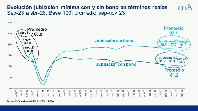 De acuerdo a estimaciones del Centro de Economía Política (CEPA), si se analizan los haberes sin bono, la caída es menor, del 2,9%. Este tipo de comparación trimestral resulta más precisa por la forma en que se actualizaba la fórmula previa.