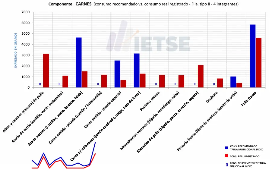 Al analizar los consumos familiares se precisó que, en el rubro carnes, se observó una fuerte concentración del consumo en pollo fresco y subproductos del mismo (51% al considerar también menudos, alitas y carcasa), en detrimento de carnes rojas (de mayor costo). Esta configuración revela “un consumo condicionado por la accesibilidad económica”, explicaron los especialistas.