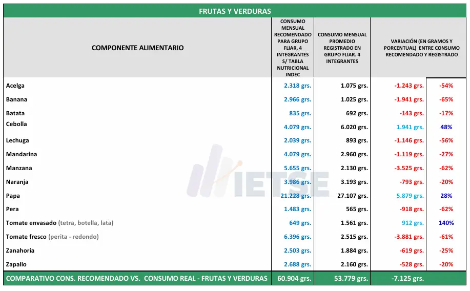 En el rubro frutas y verduras se mencionaron déficits generalizados respecto de las recomendaciones nutricionales, con reducciones superiores al 50% en frutas como banana, manzana y pera. La excepción se registra en productos de bajo costo, como la papa (28% por encima de lo recomendado) y la cebolla (48% también por encima). El tomate envasado, con un incremento del 140% respecto a lo recomendado, aparece como un sustituto directo del tomate fresco, asociado a factores de precio y rendimiento del producto.