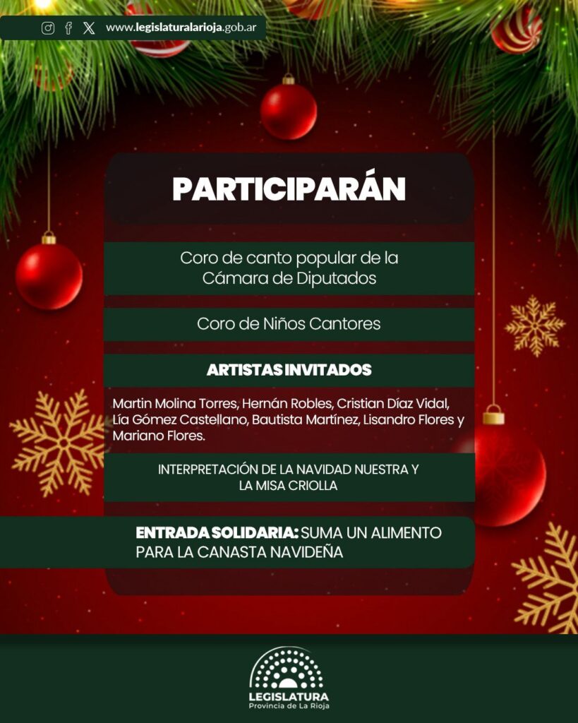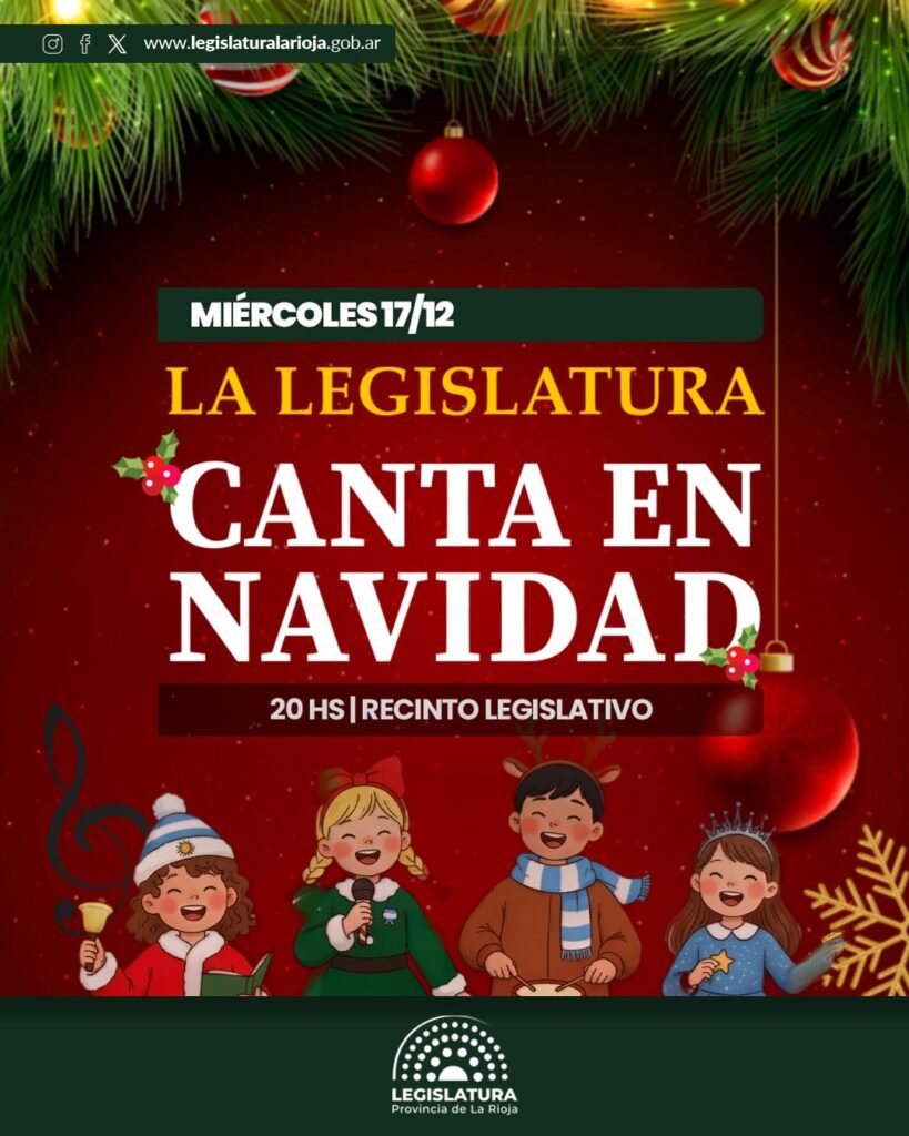 Este miércoles 17 de diciembre, a las 20 horas, el Recinto Legislativo será escenario del encuentro “La Legislatura canta en Navidad”, una propuesta cultural abierta a la comunidad impulsada por la vicegobernadora Teresita Madera, que reunirá al Coro de Canto Popular de la Cámara de Diputados, al Coro de Niños Cantores y a artistas invitados.
