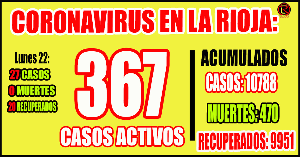 En la jornada del Lunes se registraron en La Rioja 27 casos nuevos, no hubo muertes, 27 personas recuperadas y 367 casos activos. En estos momentos tenemos 10.788 casos acumulados, hoy se recuperaron 20 personas, haciendo un total de 9951 recuperados, tenemos 367 casos activos y 470 fallecidos.