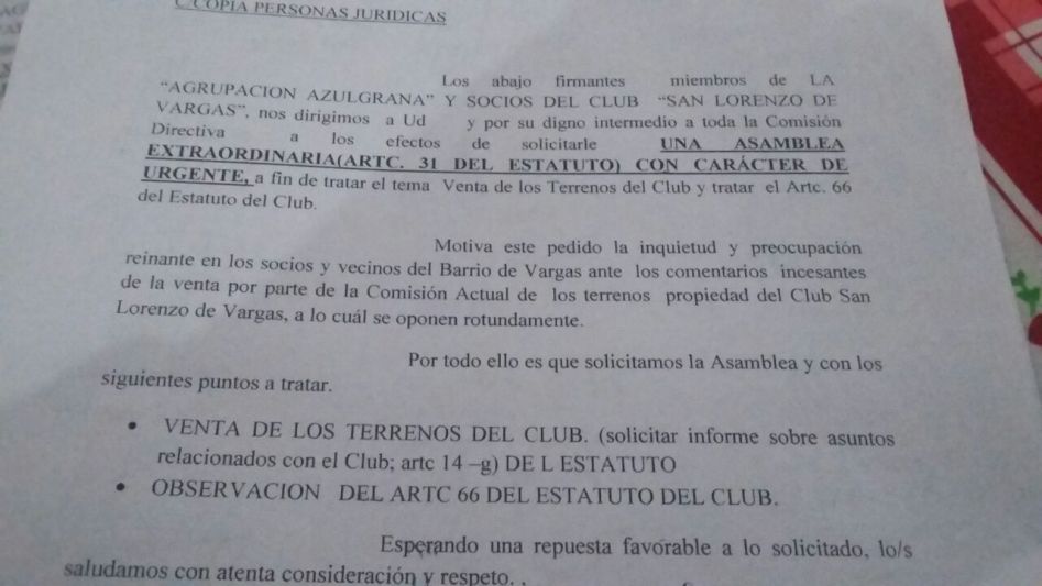 Luis Eduardo Saquilán y Graciela Vega, dos asociados y vecinos del club San Lorenzo de Vargas, pertenecientes a la Agrupación Azulgrana, en representación propia y de varios más, presentaron ayer al presidente de la entidad José Orlando Cáceres; un pedido de que convoque en los próximos 10 días como lo establece el Estatuto de la entidad, una Asamblea Extraordinaria, para tratar exclusivamente el tema de la venta de terrenos, a cuya iniciativa se oponen.
