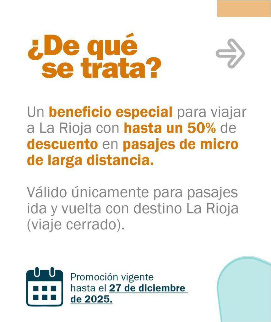 Los beneficios se aplican para pasajes ida y vuelta con destino La Rioja y fecha cerrada adquiridos a través de las empresas adheridas: Urquiza, Flecha Bus, Sierras de Córdoba y Autotransporte San Juan. La promoción es válida hasta el 27 de diciembre del 2025.