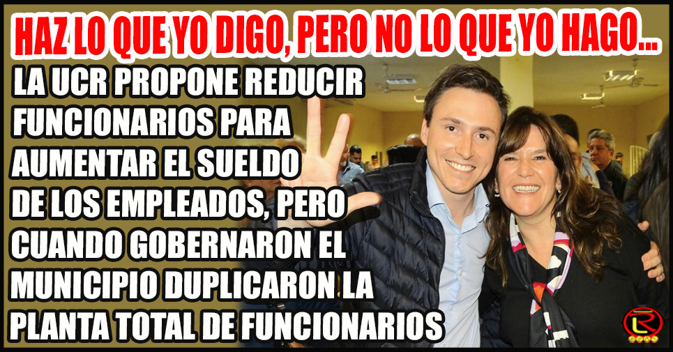 Invitado en #ElinterpretadorTV, el Concejal Nazareno Rippa -que encabeza la lista de Diputados Provinciales de SOMOS UCR- se despachó con una interesante propuesta: "si eliminamos los sueldos de los 5.000 funcionarios que tiene el Gobierno Provincial nos alcanzaría para darle un aumento salarial a todos los empleados públicos". La iniciativa tuvo la inmediata aprobación del electorado, pero: ¿qué tan creíble puede ser esa propuesta si cuando la UCR tuvo el poder en el Municipio capitalino lejos de reducir funcionarios, tuvo el récord de planta de funcionarios, duplicando la cantidad de los mismos?.
