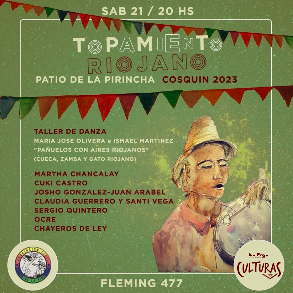 Con el apoyo del Gobierno de la Provincia, la Coordinación de Casa de La Rioja en Córdoba invita a participar este sábado, 21 de enero a las 20 horas, en el clásico Patio de la Pirincha, ubicado en Fleming 477 de la ciudad de Cosquín, de lo que se denominó Topamiento Riojano.