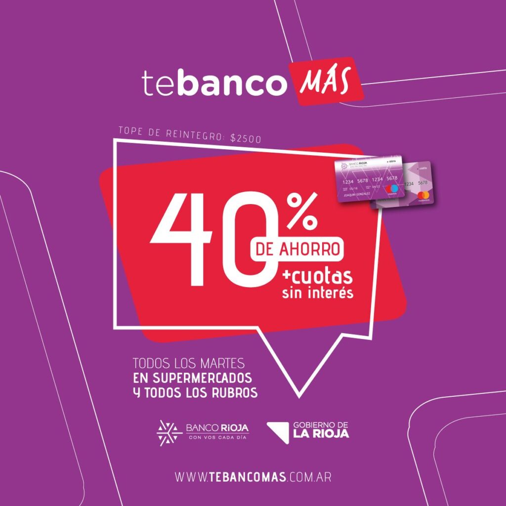 Mañana las personas clientes de Banco Rioja podrán ahorrar hasta $5000 en supermercados y comercios adheridos pagando sus compras con tarjeta de débito de la entidad y crédito MasterCard BR. Te Banco Más, la nueva promoción bancaria que impulsa el Gobierno provincial a través de Banco Rioja, permite acceder a un 40% de descuento todos los martes en más de 160 comercios adheridos de toda la Provincia.