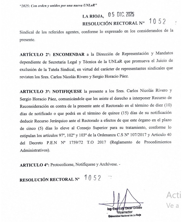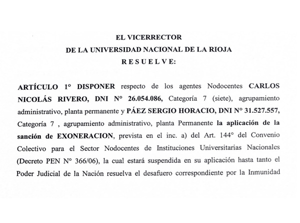 Ante la gravedad de los hechos, la actual gestión decidió aplicar la sanción máxima y avanzar con el juicio de exclusión de tutela sindical. Desde Rectorado fueron claros: no habrá impunidad para quienes usen cargos administrativos o gremiales para violar la ley o perjudicar el patrimonio público.