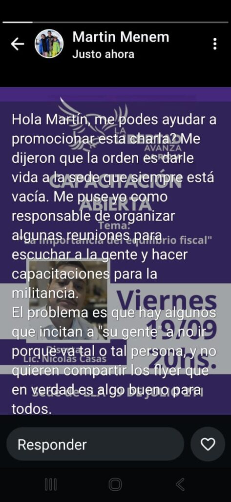 Tal es el desconcierto, que por un nuevo pifie de Martín Menem (publicó una imagen con el texto incluido que le mandaban en el mensaje), se observa como el Lic. Nicolas Casas admite que la sede partidaria está siempre ‘vacía’, y la que las feroces internas que existen en la lista hace que ni siquiera los candidatos compartan o difundan las actividades.